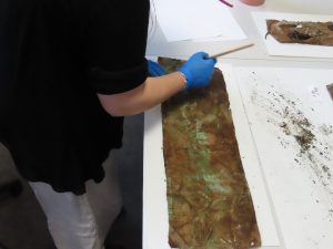 Une fois cette première étape du travail effectuée, l’entièreté des éléments textiles a été conditionnée sous la forme de poche à anoxie par notre gestionnaire des collections, Alexis Tesson, afin d’améliorer leur préservation dans le temps.