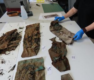 Les remarquables textiles prélevés au moment de la fouille de ce caveau du XVIIIe siècle ont été confiés à Fabienne Médard (laboratoire ANATEX), spécialiste de l’étude des outillages et des textiles anciens, venue travailler dans la laboratoire d’ANTEA Archéologie pour ce faire.