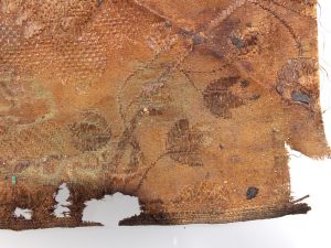 Selon les premières observations de la spécialiste, la grande majorité des tissus est en soie dont le tissage dessine des motifs floraux (fig.4), quelques pièces semblent à première vue être en laine.